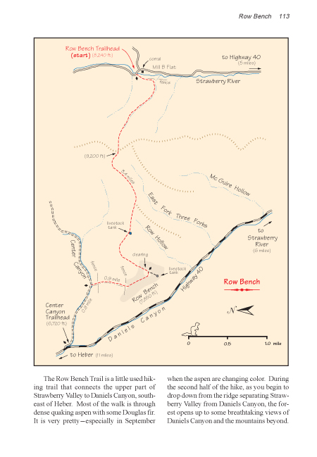 Distance: 5.2 miles (plus 14.8 miles by car) Walking time: 3 1/4 hours Elevations: 960 ft. gain, 2,520 ft. loss Trail: Little used, but not too difficult to follow. Numerous sheep trails in the area can cause some confusion. A compass is useful. Season: Summer through mid-fall. The road to Row Bench Trailhead may be closed from about December through May, and snow can be expected on the trail until mid-June. For current conditions call the Heber Ranger District, Uinta National Forest, at (435) 654-0470. Vicinity: Daniels Canyon, near Heber |